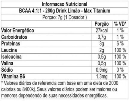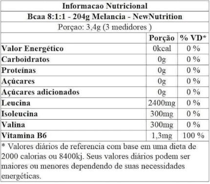 L-leucina, L-isoleucina, L-valina, cloridrato de piridoxina (vitamina B6), deslizante talco e antiumectante dióxido de silício.