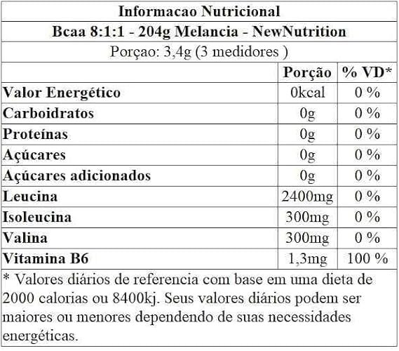 INGREDIENTES: L-Leucina, L-Isoleucina, L-Valina, ácido cítrico, aroma sintético idêntico ao natural de melancia, corante natural beterraba, edulcorante sucralose e vitamina B6.