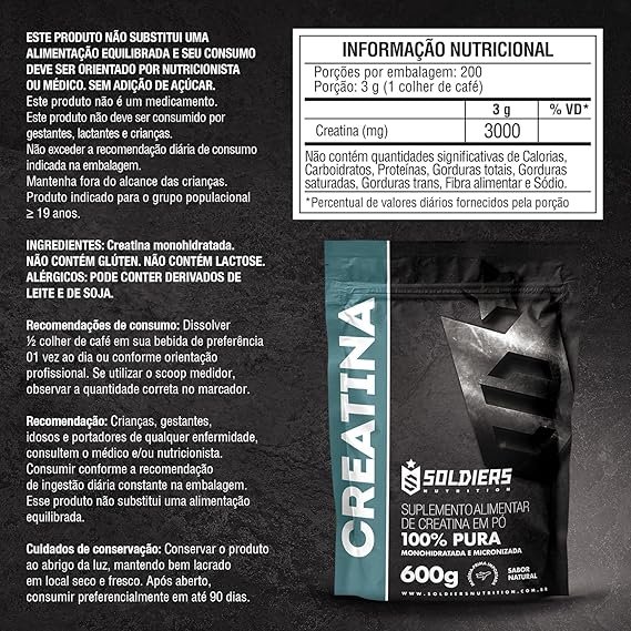- 【FACILIDADE DE CONSUMO】 A Creatina Monohidratada Soldiers Nutrition é 100% pura e se dissolve e mistura facilmente com qualquer bebida, garantindo uma ingestão prática. Sua fórmula de alta qualidade proporciona absorção rápida e eficaz, otimizando seus treinos, capacidade cognitiva ou saúde do dia a dia.