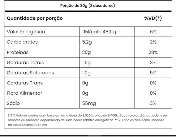 100% Proteína concentrada do soro do leite, aroma idêntico ao natural de baunilha, goma xantana, educorantes acessulfame de potássio e sucralose