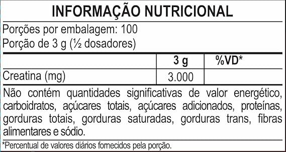 DESCRIÇÃO A Creatina da MasterWay é um suplemento alimentar em pó 100% puro. BENEFÍCIOS A Creatina auxilia no aumento do desempenho físico durante exercícios repetidos de curta duração e alta intensidade. DIFERENCIAIS – 100% Pura; – 3g por porção; – Monohidratada; – Zero glúten. *Produto em conformidade com as normas da ANVISA. APRESENTAÇÃO Suplemento Alimentar de creatina em pó; Peso líquido: 300 g.