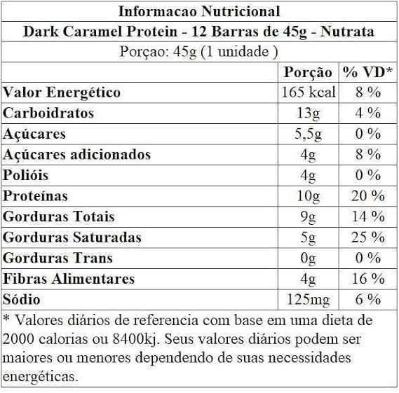Nutrata Caramel Protein Display (12 unid. 45g) Descubra a Nutrata Caramel, uma deliciosa barra de proteína com recheio macio de caramelo, amendoim crocante e uma irresistível cobertura de chocolate. Muito mais nutritiva do que um chocolate comum, ela é a escolha perfeita para o seu dia a dia. Experimente agora nossas duas versões e transforme seus lanches em momentos de puro prazer e saúde! Benefícios: – 10 gramas de proteína;- 50% menos carboidratos que um chocolate comum;- 78% menos açúcar que um chocolate comum;- Com whey protein;- Zero gordura trans;- Sem adoçantes artificiais.