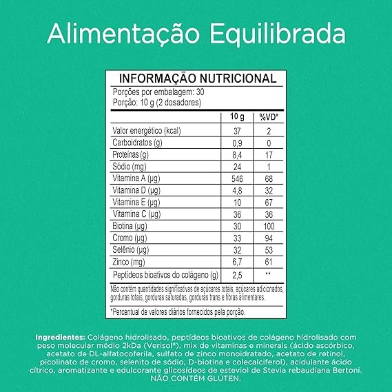 : Colágeno hidrolisado, colágeno hidrolisado bioativo (Verisol®), mix de vitaminas e minerais [vitamina C (ácido ascórbico), vitamina E (DL alfa-acetato de tocoferol), zinco (sulfato de zinco mono-hidratado), vitamina A (acetato de retinol), cromo (picolinato de cromo), selênio (selenito de sódio), vitamina H (biotina) e vitamina D (colecalciferol)], acidulante ácido cítrico, aroma sintético idêntico ao natural, edulcorante estévia e corante betacaroteno