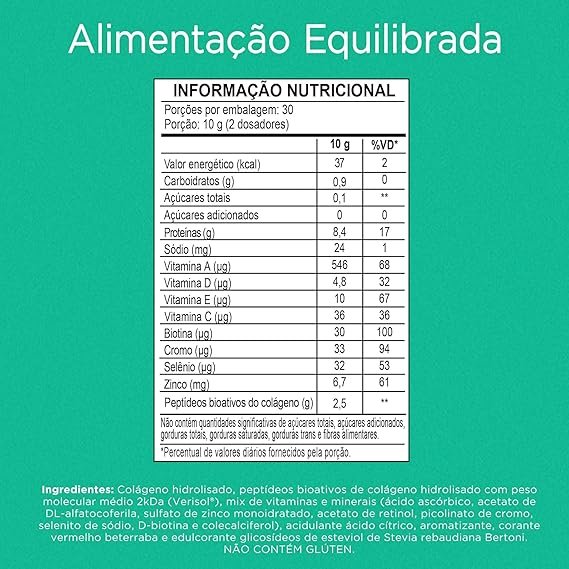 : Colágeno hidrolisado, colágeno hidrolisado bioativo (Verisol®), mix de vitaminas e minerais [vitamina C (ácido ascórbico), vitamina E (DL alfa-acetato de tocoferol), zinco (sulfato de zinco mono-hidratado), vitamina A (acetato de retinol), cromo (picolinato de cromo), selênio (selenito de sódio), vitamina H (biotina) e vitamina D (colecalciferol)], acidulante ácido cítrico, aroma sintético idêntico ao natural, edulcorante estévia e corante betacaroteno