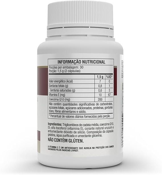 | Ingredientes | Triglicerídeos de cadeia média, coenzima Q10, DL-alfatocoferol (vitamina E), corante natural de urucum e antiumectante dióxido de silício. Composição da cápsula: gelatina, água purificada e umectante glicerina. NÃO CONTÉM GLÚTEN. |