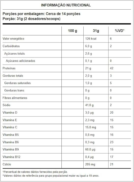 Concentrado proteico de soro de leite (concentrado proteico de soro de leite fluido e emulsificante lecitinas), cacau em pó, mix de vitaminas e mineral [maltodextrina, fosfato de cálcio tribásico (cálcio), ácido ascórbico (vitamina C), acetato de DL-alfa-tocoferol (vitamina E), colecalciferol (vitamina D), D-pantotenato de cálcio (ácido pantotênico – vitamina B5), cloridrato de piridoxina (vitamina B6), ácido fólico (vitamina B9) e cianocobalamina (vitamina B12)], maltodextrina, estabilizantes: goma guar e goma xantana, aromatizantes e edulcorante sucralose.