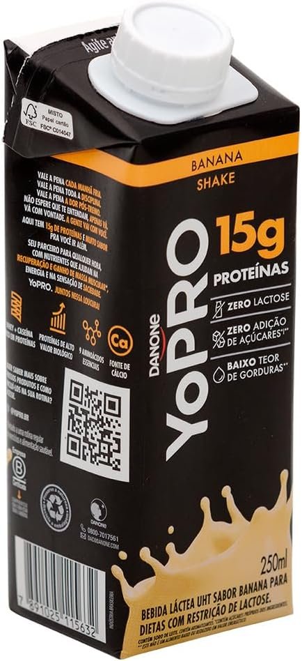 Potencialize seus treinos com YoPRO Bebida Láctea UHT Banana 15g de proteínas 250ml – 12 unidades. YoPRO é a marca especialista em criar produtos com alto teor de proteínas, práticos e deliciosos para quem busca uma rotina ativa e saudável. YoPRO é proteína, sabor e praticidade para sua rotina. Você pode consumir seu YoPRO Shake Proteico UHT 15g de proteínas a qualquer momento, seja como parte do seu café da manhã, como lanche entre as refeições ou antes e depois dos treinos. Sua fórmula prática e deliciosa permite que você o leve para onde quiser, seja na academia ou no trabalho. É essencial para você que busca um estilo de vida ativo e saudável, além de com o seu consumo de proteínas diárias, é um aliado para sua performance física e seu bem-estar, complementando a sua rotina de forma saudável e saborosa. Experimente e vá além! Ingredientes: leite parcialmente desnatado, concentrado proteico de soro de leite, cacau hidratado, amido modificado, concentrado proteico de leite, soro de leite em pó, enzima lactase, aromatizantes, estabilizantes celulose microcristalina, carboximetilcelulose, carragena, fosfato dipotássico e fosfato dissódico e edulcorante sucralose. NÃO CONTÉM GLÚTEN. ALÉRGICOS: CONTÉM LEITE E DERIVADOS. PODE CONTER SOJA.